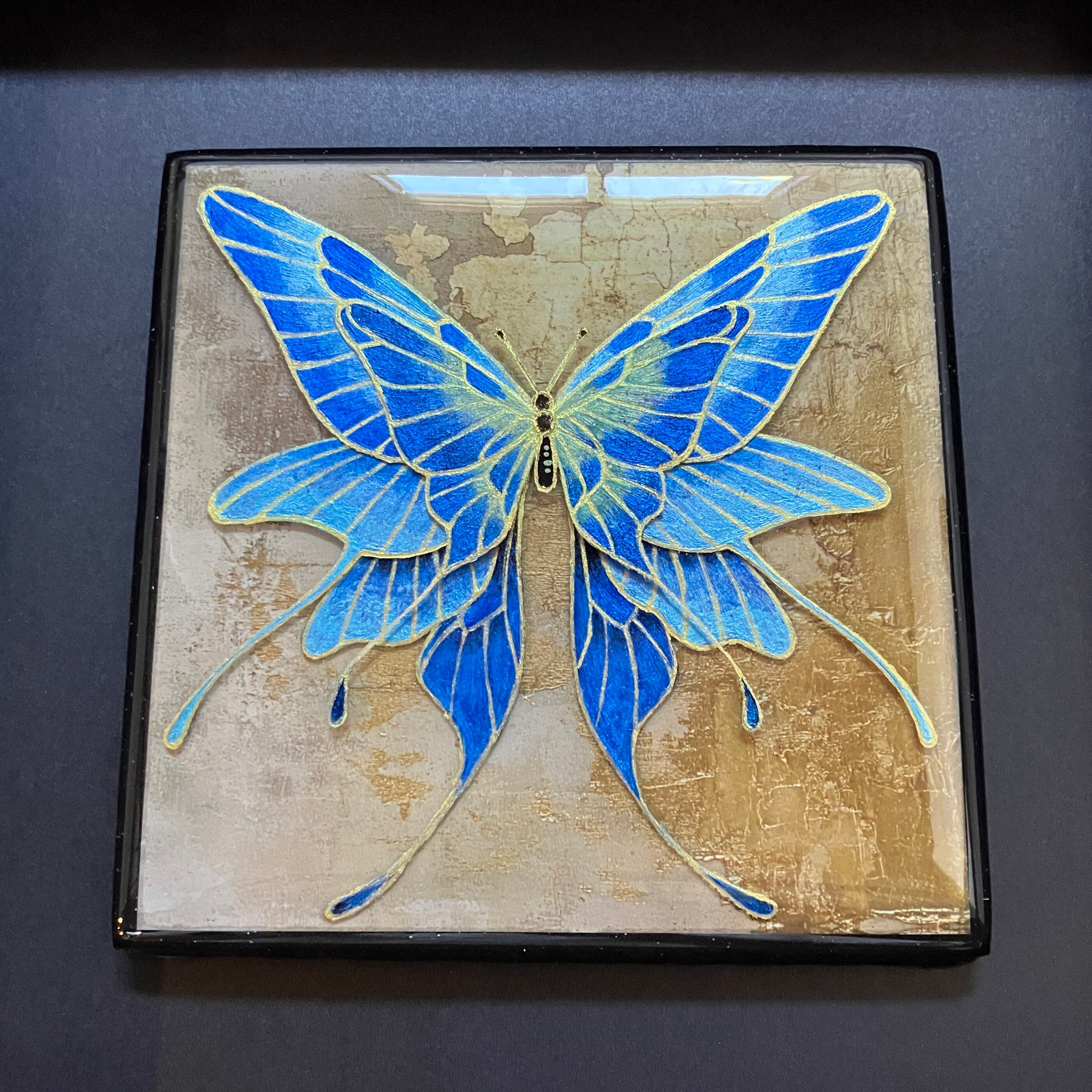 今回制作したのはレジンを4層流し固めながら、蝶の羽も4層重ねる様に絵描いて仕上げました